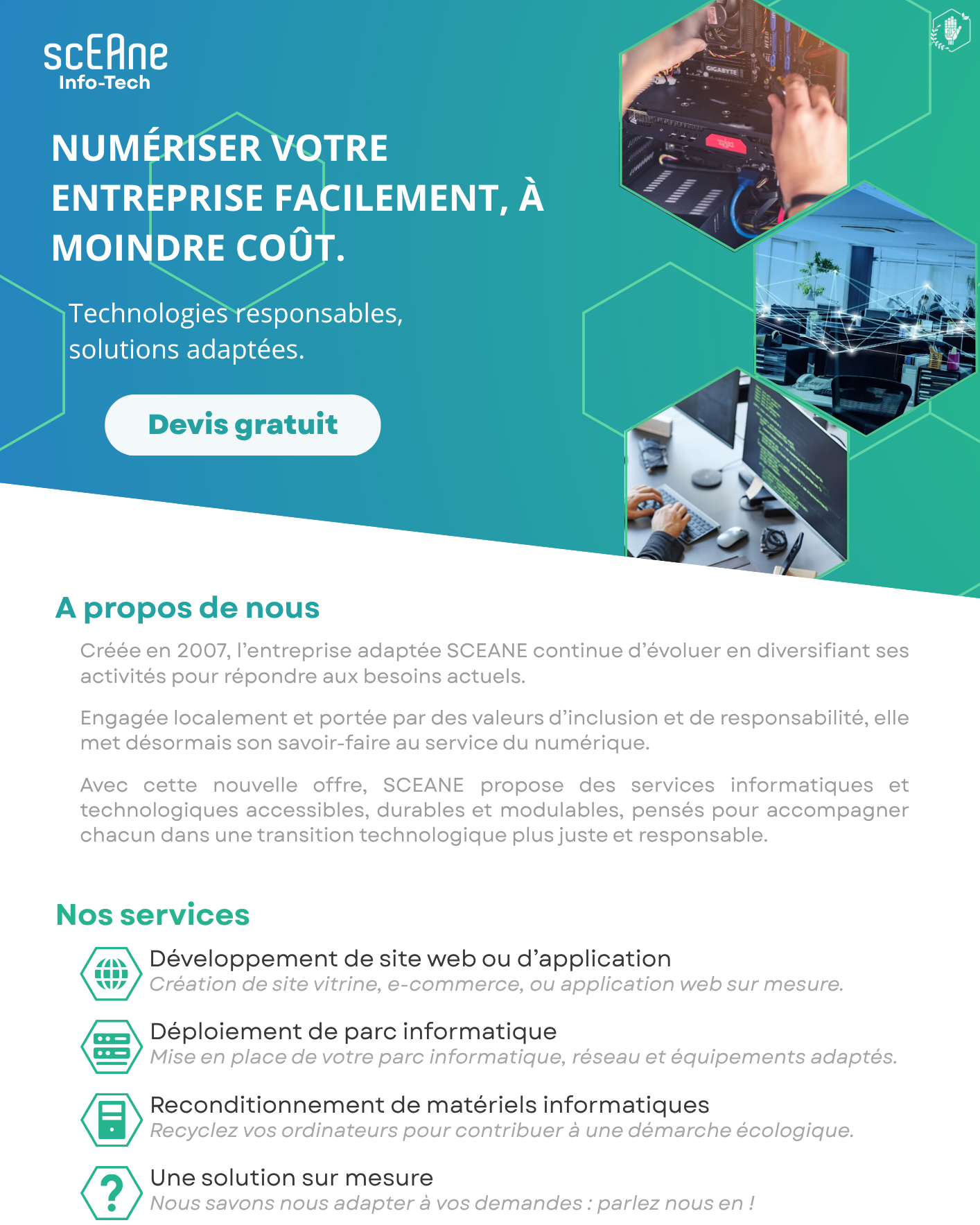 "Notre mission est d'apporter des solutions informatiques adaptées aux besoins de nos clients tout en garantissant une démarche écologique et responsable."